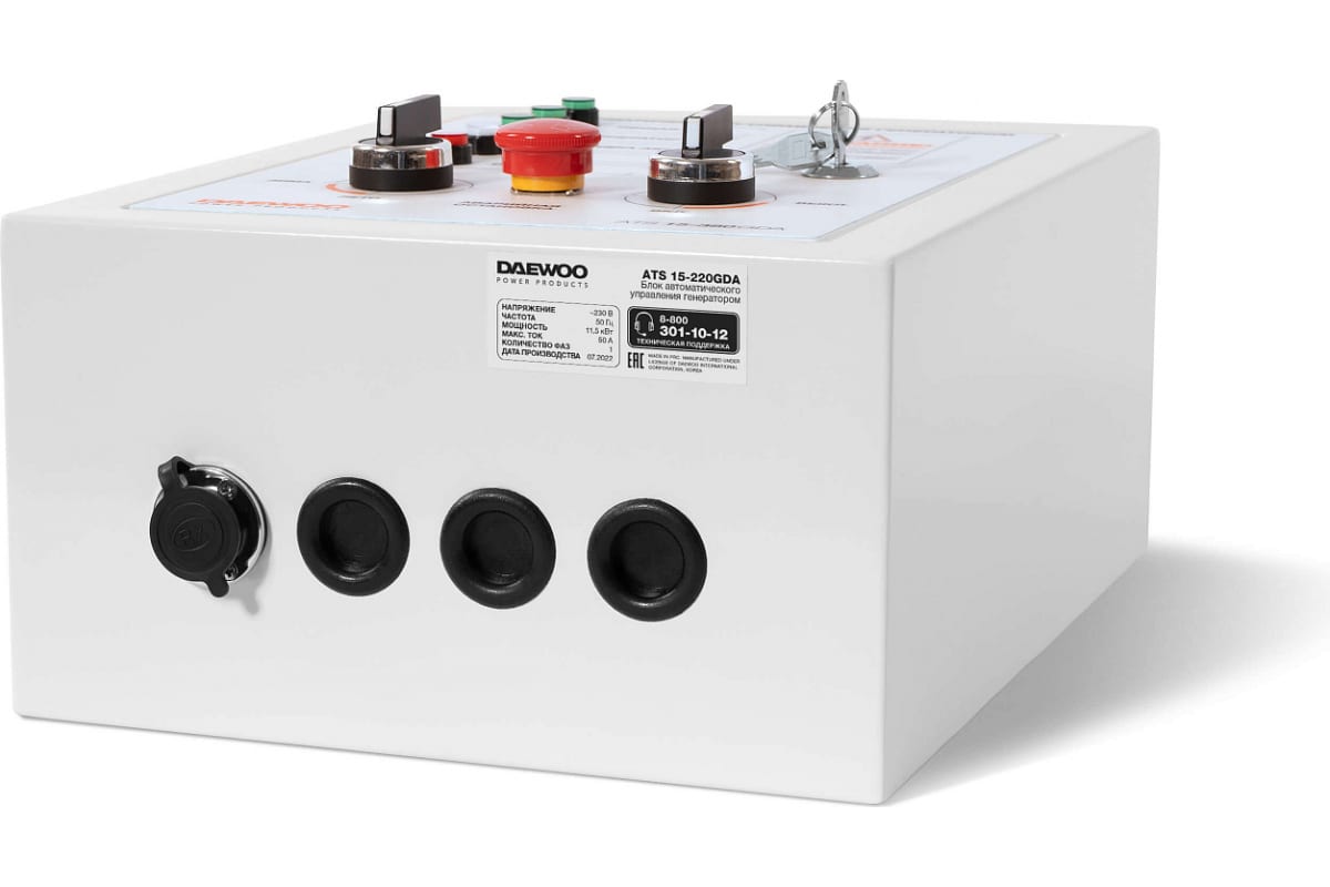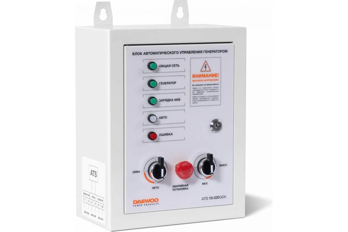 Блок DAEWOO ATS15-220GDA обеспечивает автоматический запуск бензиновых генераторов DAEWOO GDA 7500E, GDA 7500DFE, GDA 8500E, GDA 9500E, GDA 12500E в случае падения напряжения в основной сети или прекращения подачи электроэнергии. При возобновлении подачи электричества автоматика переводит питание на внешнюю сеть и отключает генераторную установку. Блок автоматики имеет крепление для монтажа на стену. Частота тока сети - 50 Гц. Напряжение зарядки аккумулятора - 12 В. Длина кабеля управления - 2 м. Количество фаз - 1.